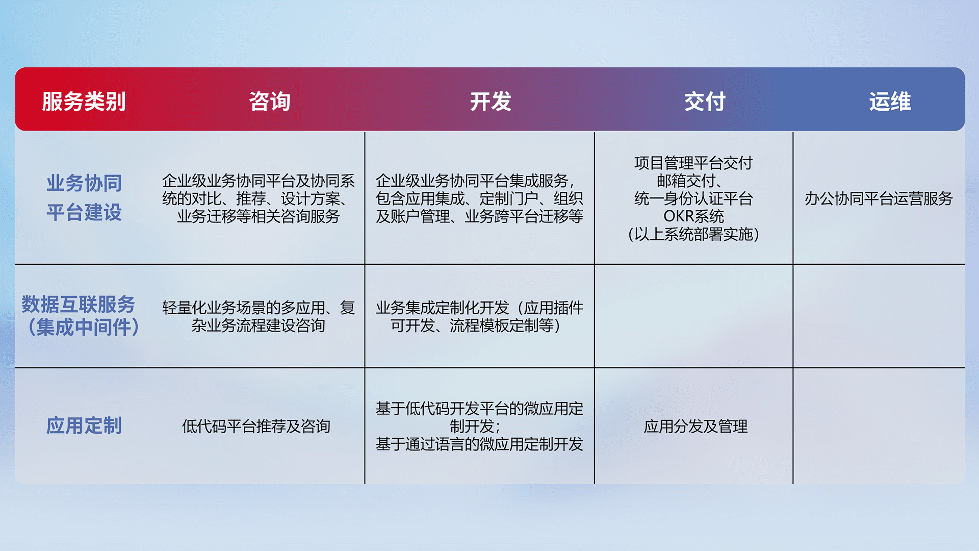 针对钉钉、、企微、、、、IDaas等平台级产品提供产品的规划、、、、方案、、、、交付、、定制化开发等服务,,,实现如统一协同办公、、、、智能客户服务、、、混合会议管理、、智能数据查询、、、等业务场景,,,,实现数字化转型。。。